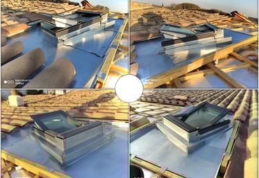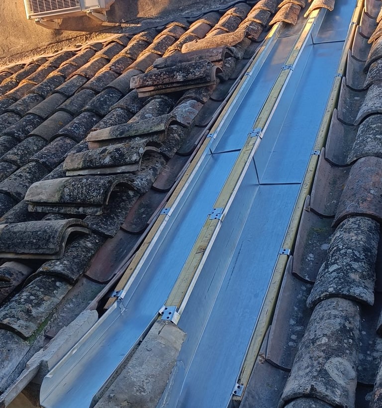 Réparation d'un raccord présentant un défaut d’étanchéité entre deux toitures de pentes différentes.