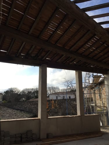 Cette toiture a été entièrement rénovée de la charpente, jusqu'à la couverture en tuile canal traditionnelle, en passant par l'isolation. Cette reprise totale de la toiture a permis de créer un plafond cathédrale peint en noir velours.